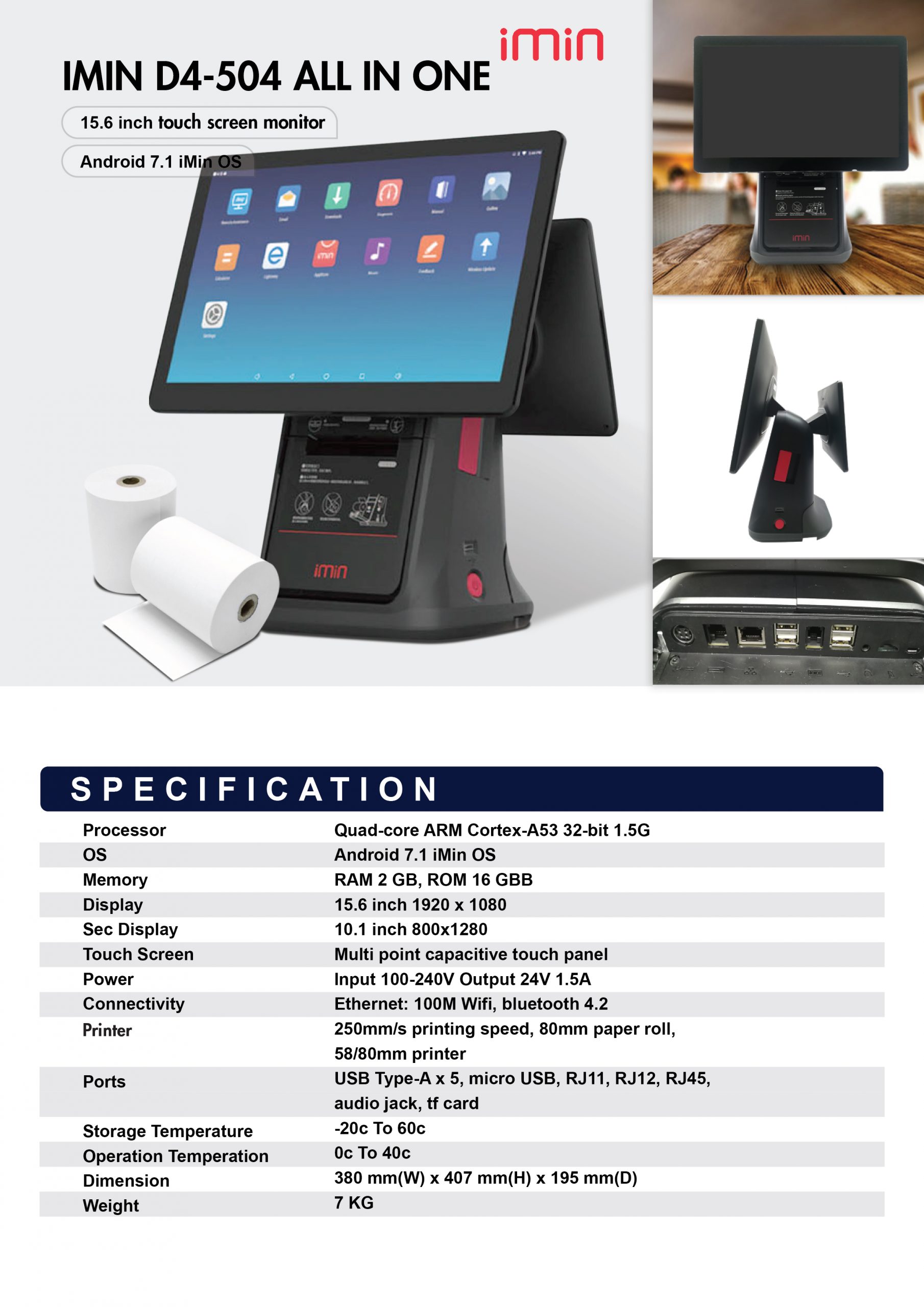 - Processor Quad-core ARM Cortex-A53 32-bit 1.5G – Android 7.1 iMin OS