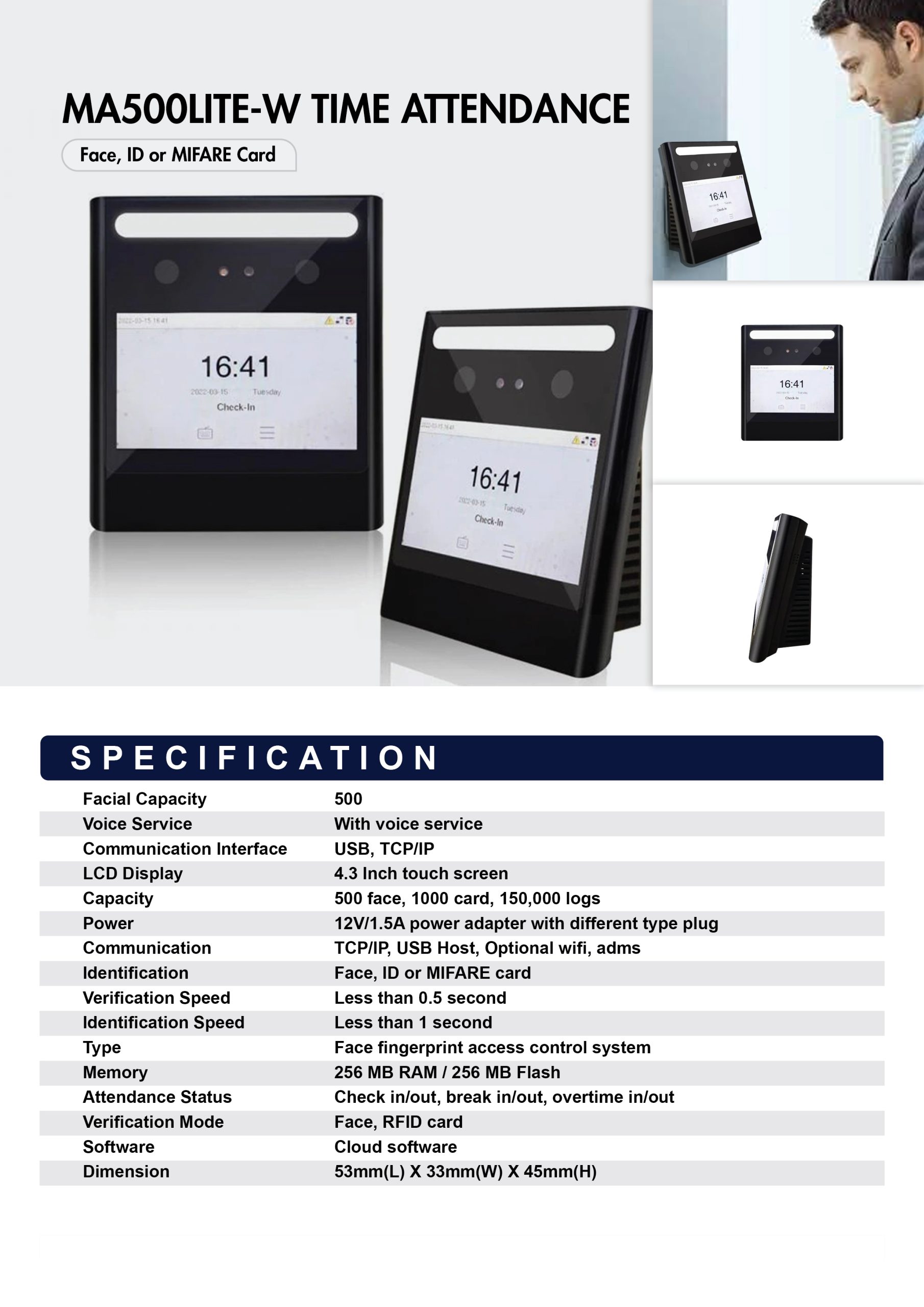 | Identification | Face, ID or MIFARE card |