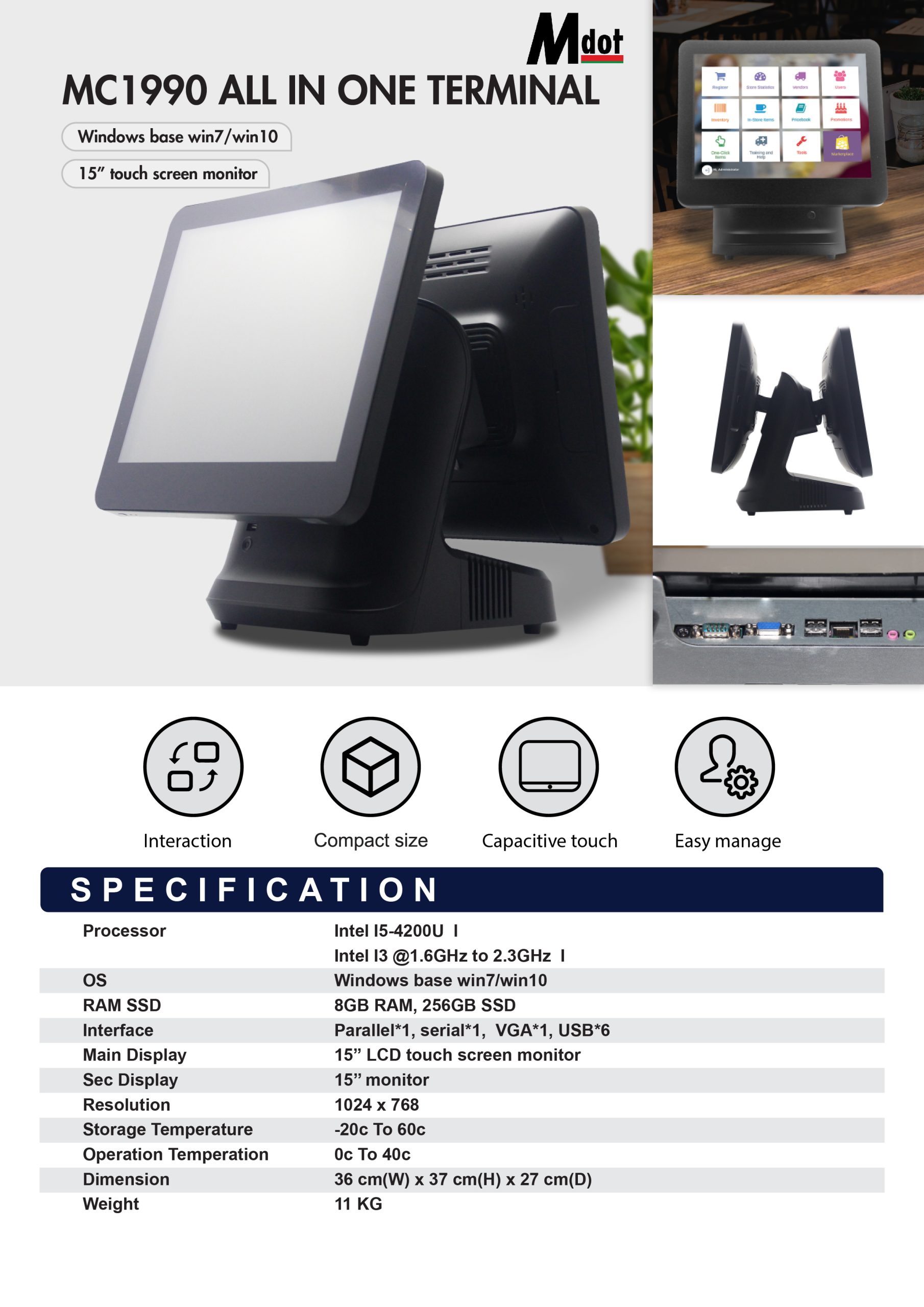 | Display | 15” LCD touch screen monitor |