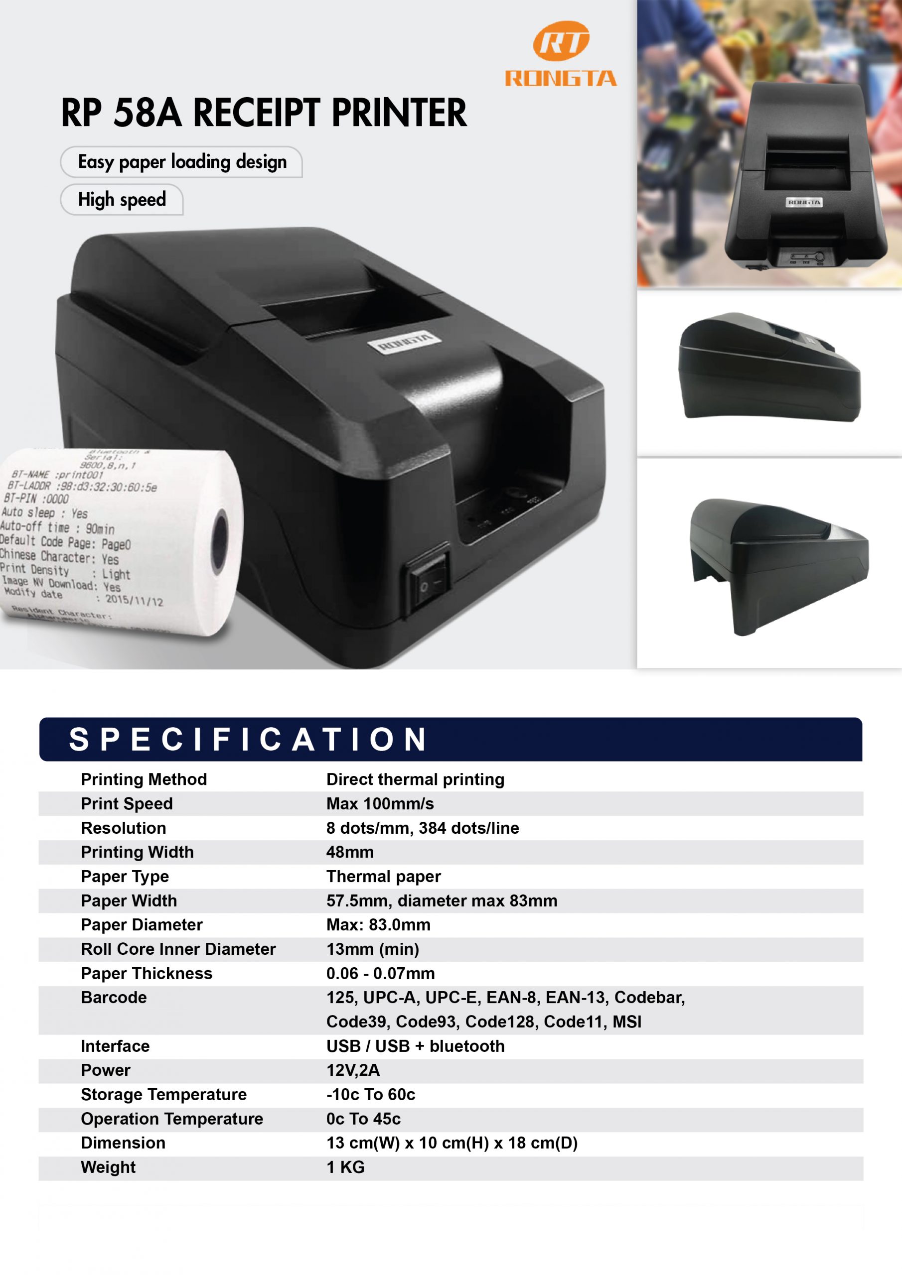 | Paper Width | 57.5mm, diameter max 83mm |